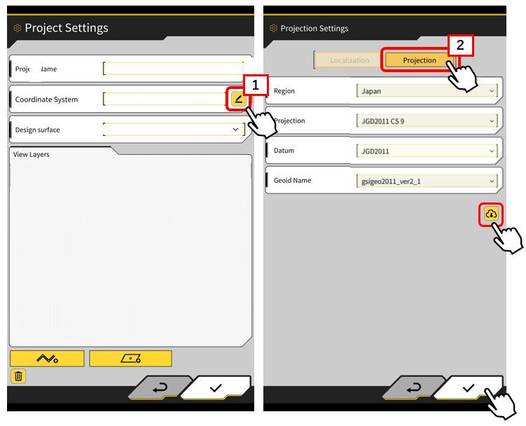 Since the coordinate system is not selected, tap 【"1"the pencil icon】 to set 【"2"the projection】.