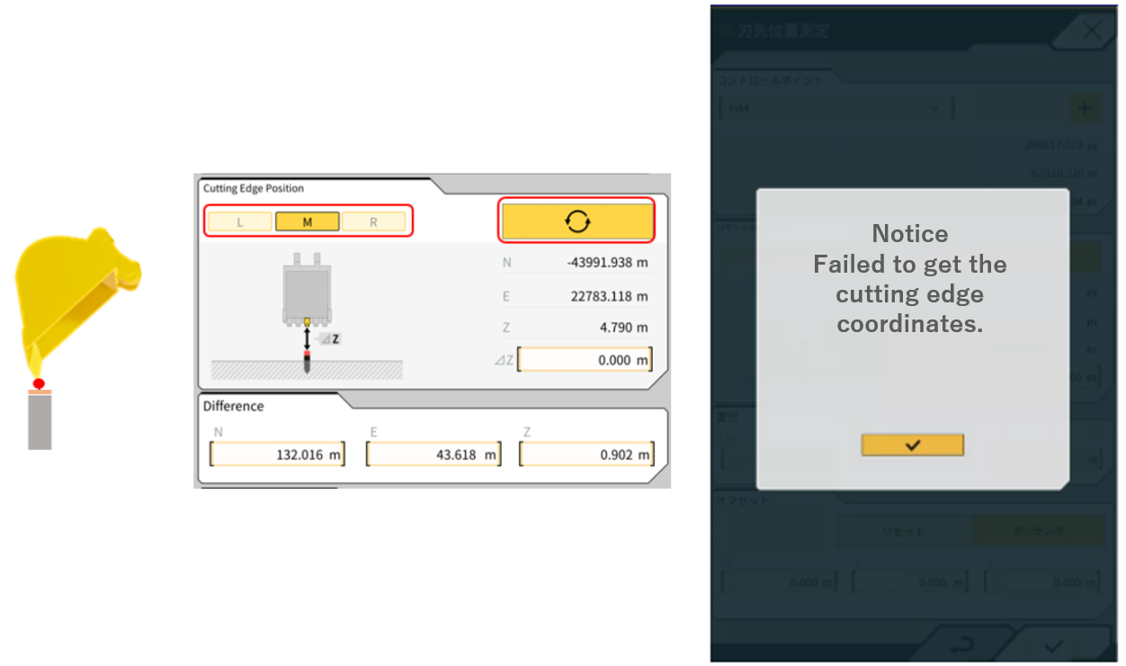 This warning is displayed due to a lack of valid data (e.g., location information from each sensor or satellite) when calculating the cutting edge position. Please check the following to identify the cause.
