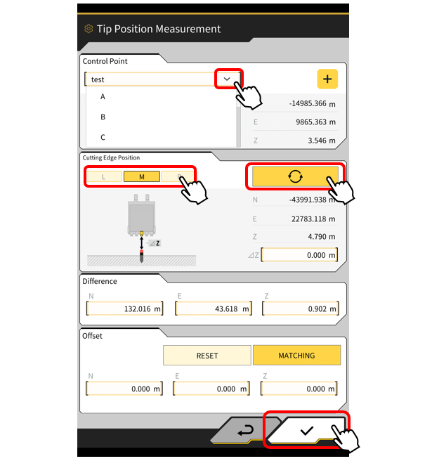 1) Tap the 【"1"icon】 below to measure 【"2"the terrain at the cutting edge】.