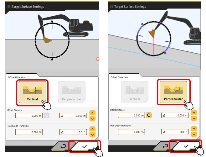 2) If the excavation line has already been determined, place the bucket at the second point and tap the bucket icon.