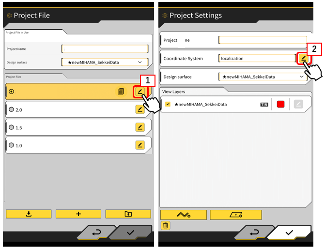 3.Tap 【"1”the pencil button】 of the currently selected project, and then tap 【"2"the pencil button】 of the coordinate system.